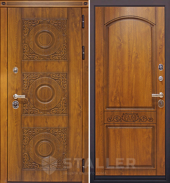 Отделка снаружи: МДФ влагостойкий 16 мм, Покрытие: пленка Винорит. Цвет "Дуб золотистый", патина, лак. Наличник ЛОГО